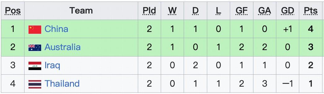 11月14日晚19点30分,中国vs泰国和伊拉克vs澳大利亚两场比赛同时开打。两轮过后,中国队积4分,澳大利亚积3分,伊拉克积2分,泰国积1分。