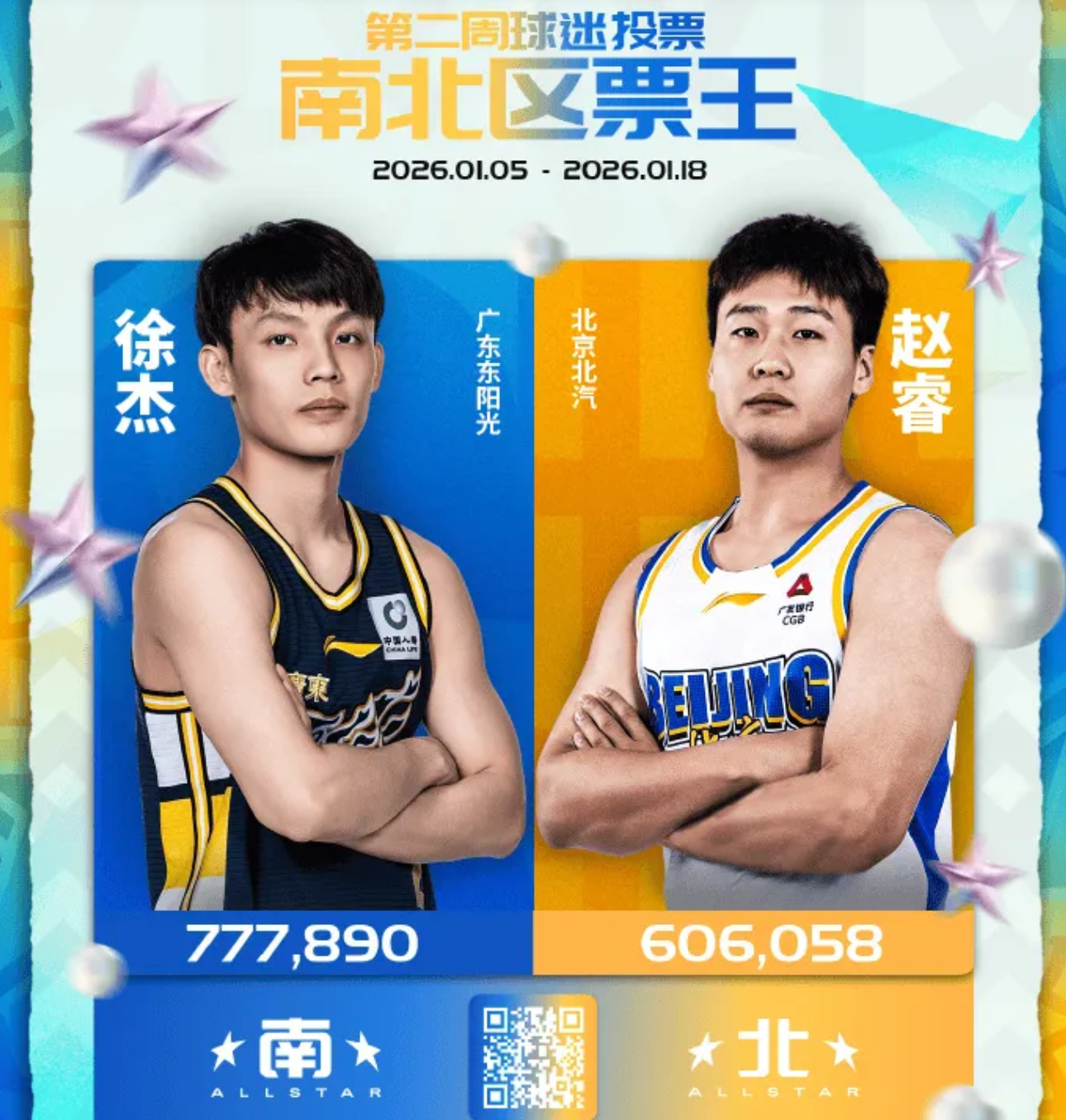 刚刚,CBA正式公布2026全明星投票第二周结果,从票数来看,广东队后场悍将徐杰,继续成为了南区的票王,同时,他依然是CBA全明星赛的总票王。北京队的后场悍将赵睿,则成为北区的票王。
